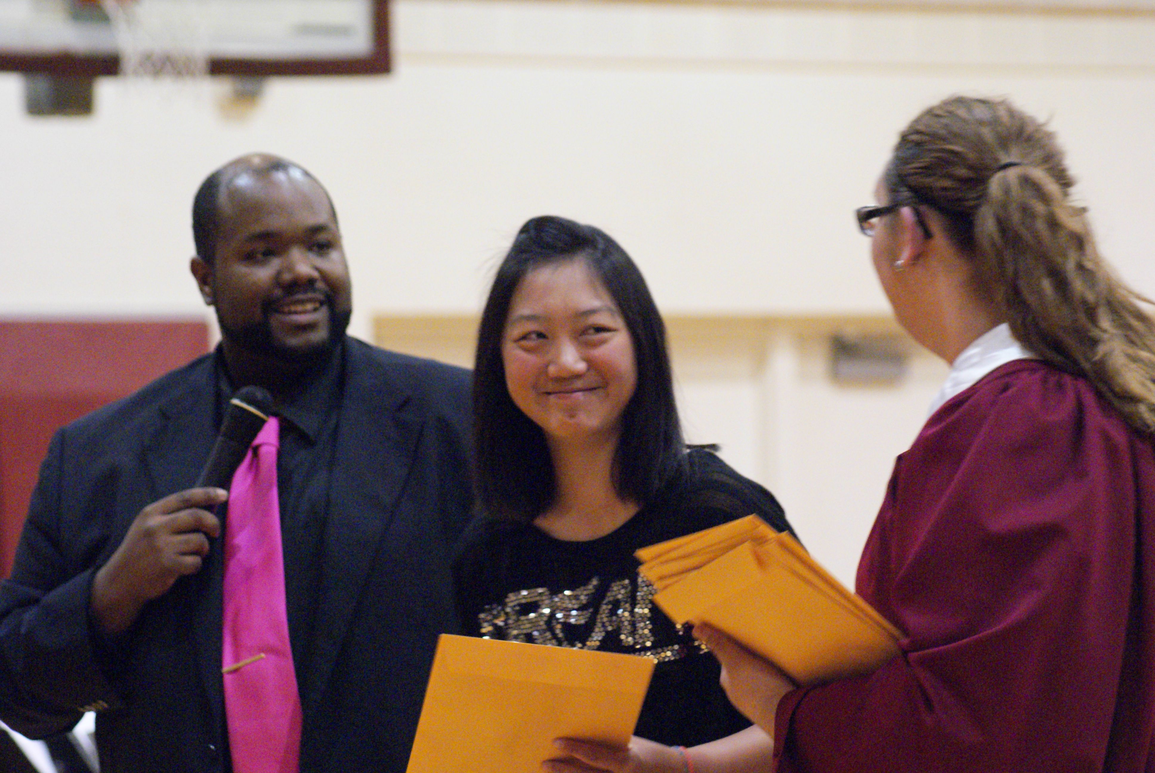 The Spring Concert is also an awards night. Seen here are John Mayo handing out awards to Sophie Hsu with the help of Jessie Mutum. Photo Courtesy of LDNE.