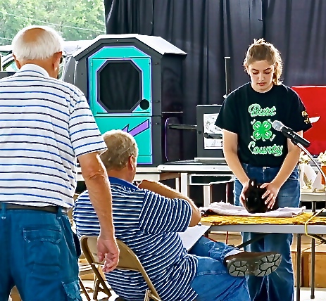 Amelia Schlichtung shows her rabbit to the judge, answering questions too. Both Photos, credit of Denise Gilliland, Editor and Chief, Kat Country Hub.