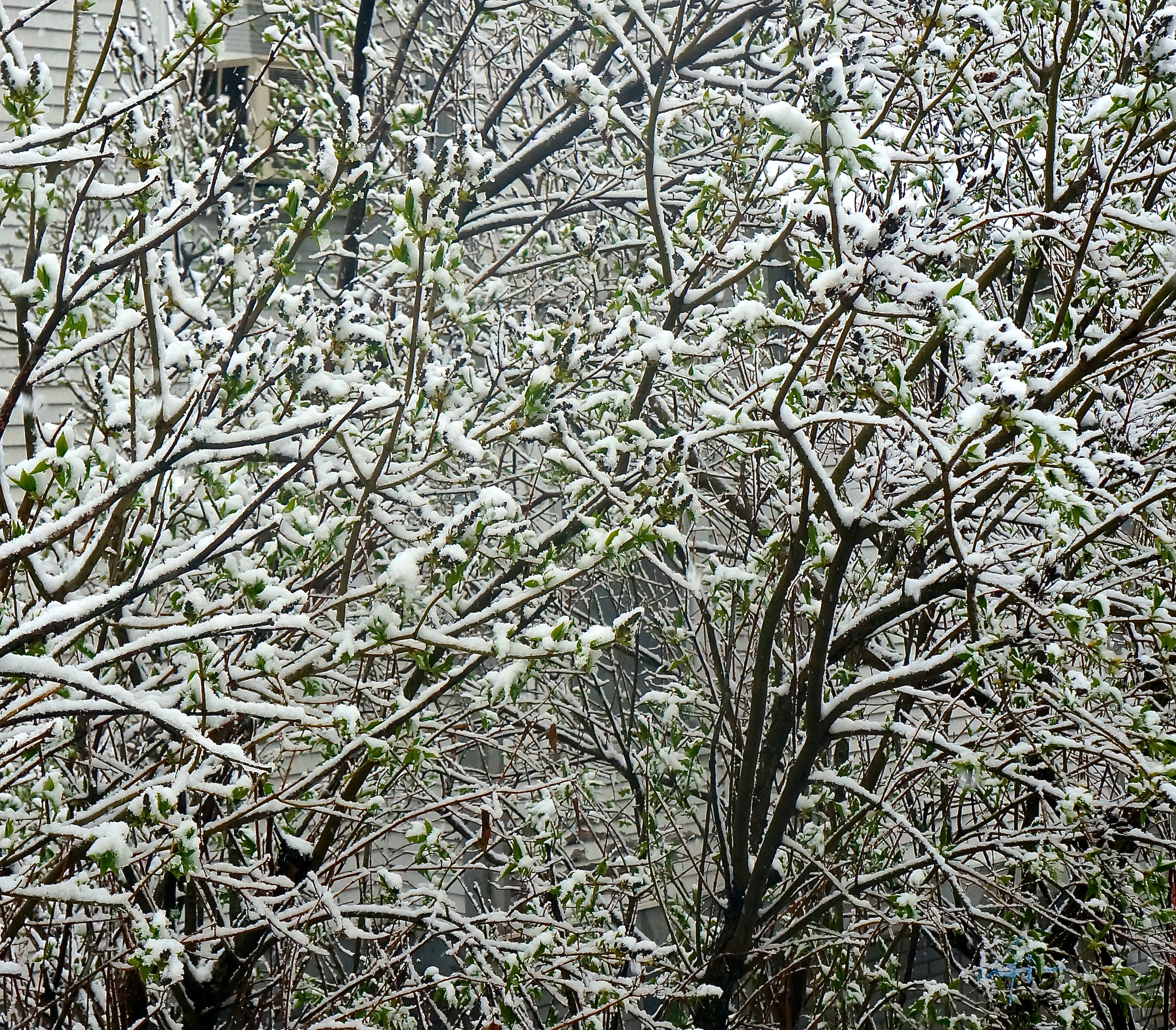This lilac bush is ready for Spring, but Mother Nature had other plans on Thurs., April 9th. Nice wet snow covered the branches, but the buds could still be seen. Photo Credit/Denise Gilliland, Editor and Chief, Kat Country Hub.