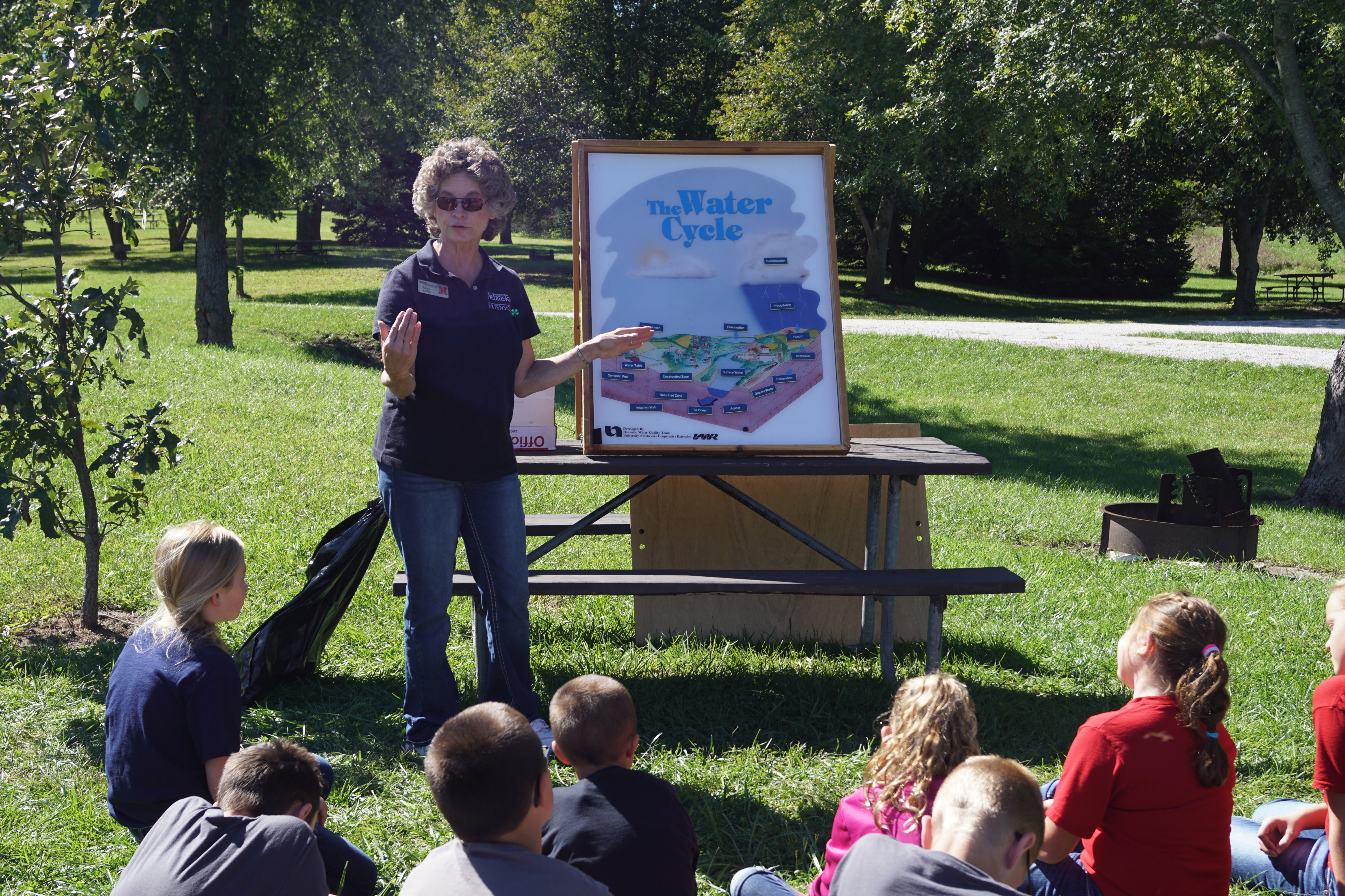 Mary Loftis, Extension Associate in Burt County explains the Water Cycle to this group of 6th grade students during the Sixth Grade Conservation Day at Summit Lake. – photo by Jennifer Hansen