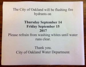 Reminder: City of Oakland Flushing Hydrants Today and Tomorrow!