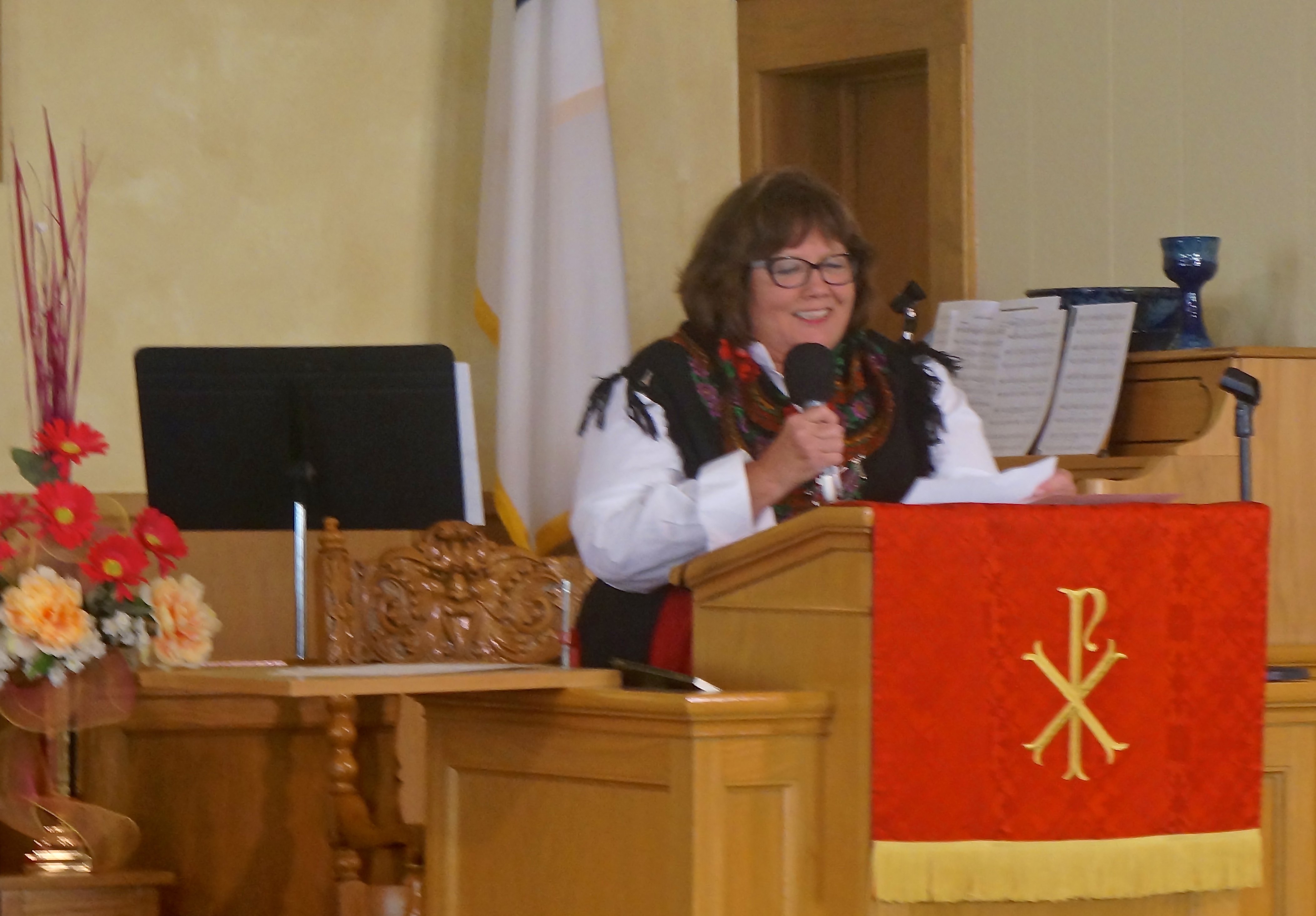 Debbie Anderson, at the podium, speaking about her parents, Ed and Betty Hanna, the Oakland Swedish Festival King and Queen. Photo Credit/Denise Gilliland, Editor and Chief, Kat Country Hub.